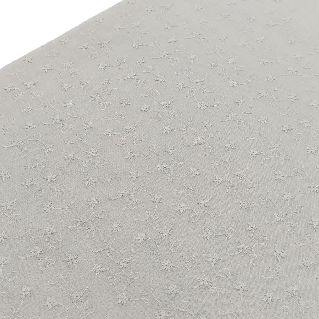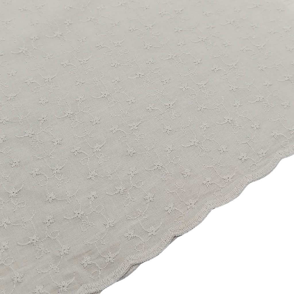 Tela batista bordada en color lino con puntas en las orillas en forma de ondas. Es un tejido de excelente calidad, finura y perfecto para la confección de prendas infantiles.