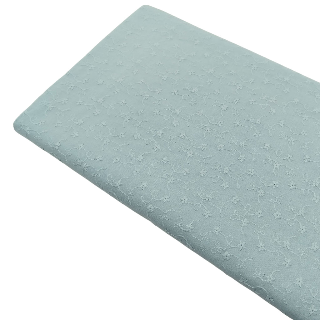 Tela batista bordada en color verde menta con puntas en las orillas en forma de ondas. Es un tejido de excelente calidad, finura y perfecto para la confección de prendas infantiles.