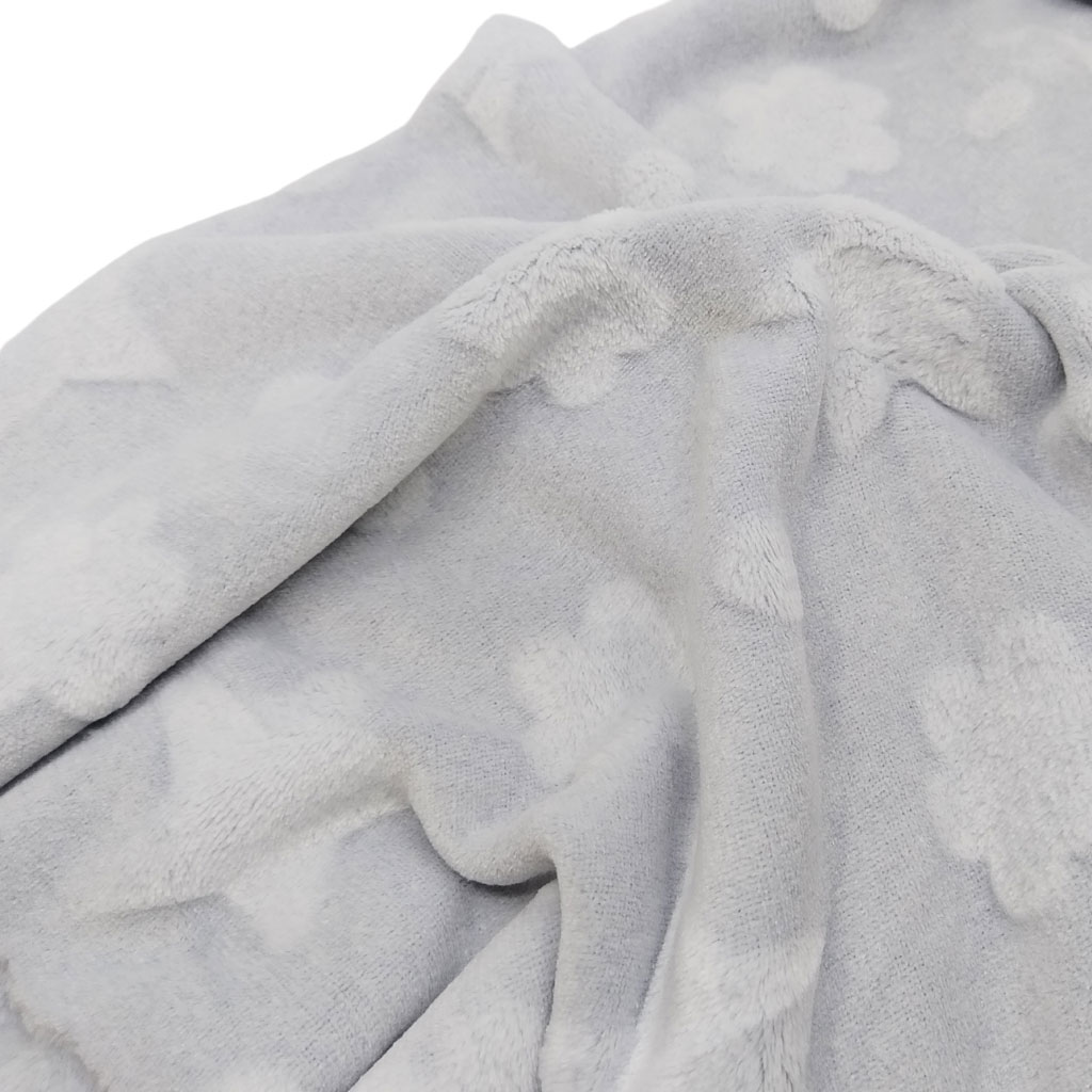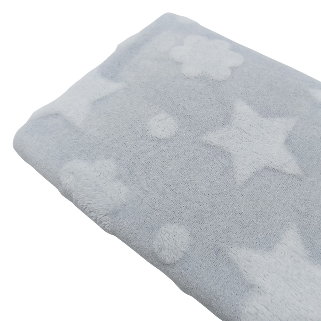 Tela de coralina gris con dibujos en relieve de estrellas, nubes y círculos. Este tipo de coralina se utiliza para confeccionar mantas, pijamas y batas. Es muy suave, confortable y aporta calor extra en la época invernal.