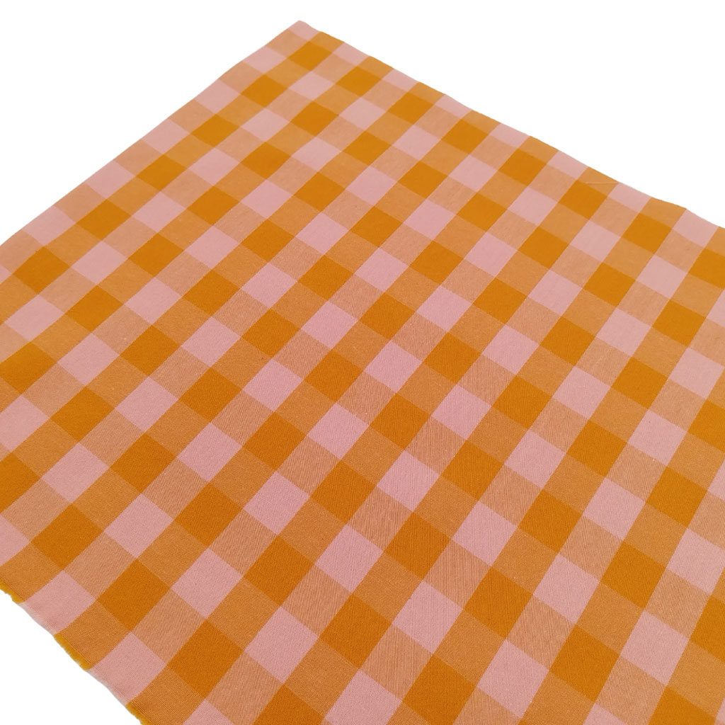 Tela de cuadro vichy bicolor 100% algodón en colores naranja y salmón. Es una tela vichy muy suave y su cuadro mide 16 milímetros. Se puede coser todo tipo de ropa infantil y de bebé.