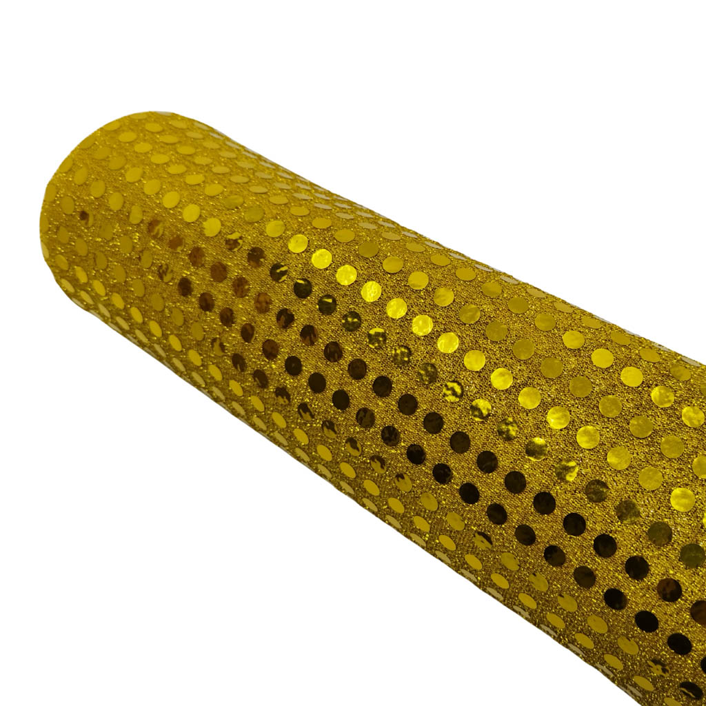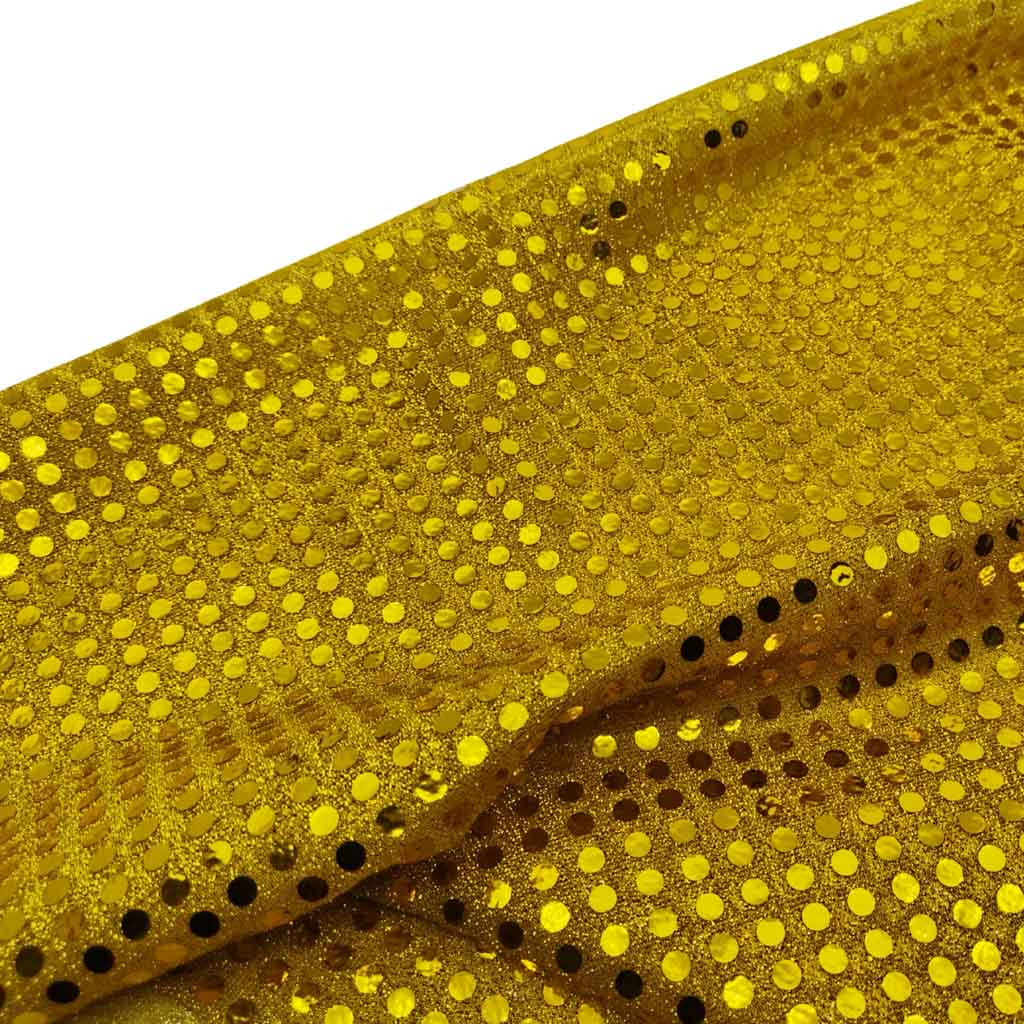 Tela de lentejuelas color amarillo. Las lentejuelas son planas, miden 6 mm de diámetro y van adheridas sobre tela de punto lúrex. Esta tela es perfecta para realizar disfraces de carnaval y trajes para espectáculos.
