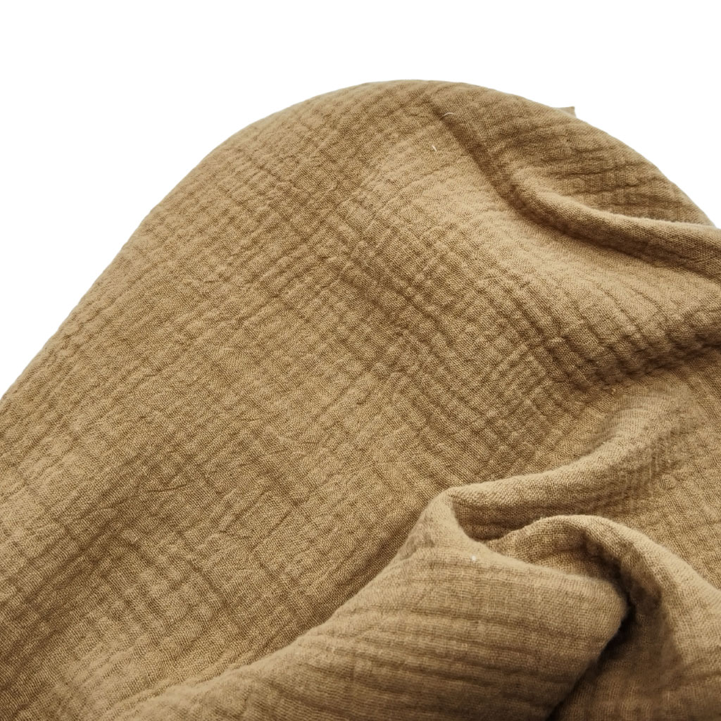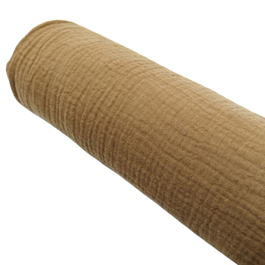 Tela de muselina de gasa doble en algodón 100% en color liso camel. Esta tela es muy suave y semitransparente. Es ideal para confeccionar gasas, muselinas, pañales, ropa para bebé, complementos e incluso para decorar la habitación del bebé. Además, es perfecta para los más peques, ya que está libre de tóxicos.