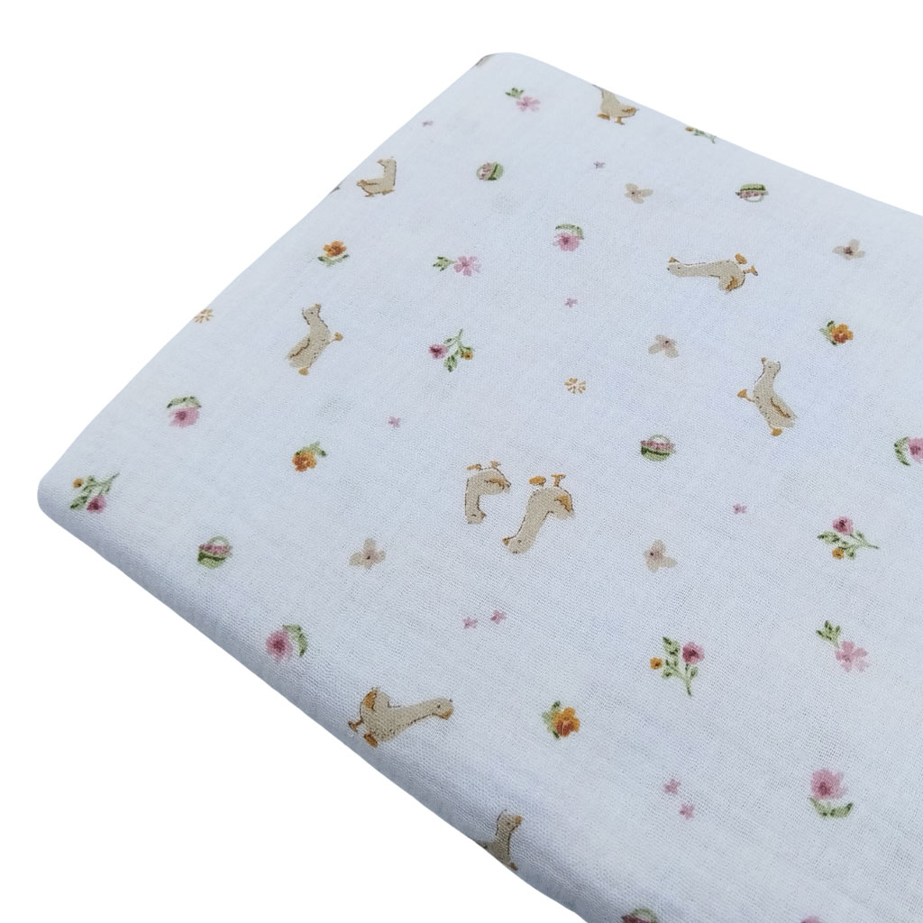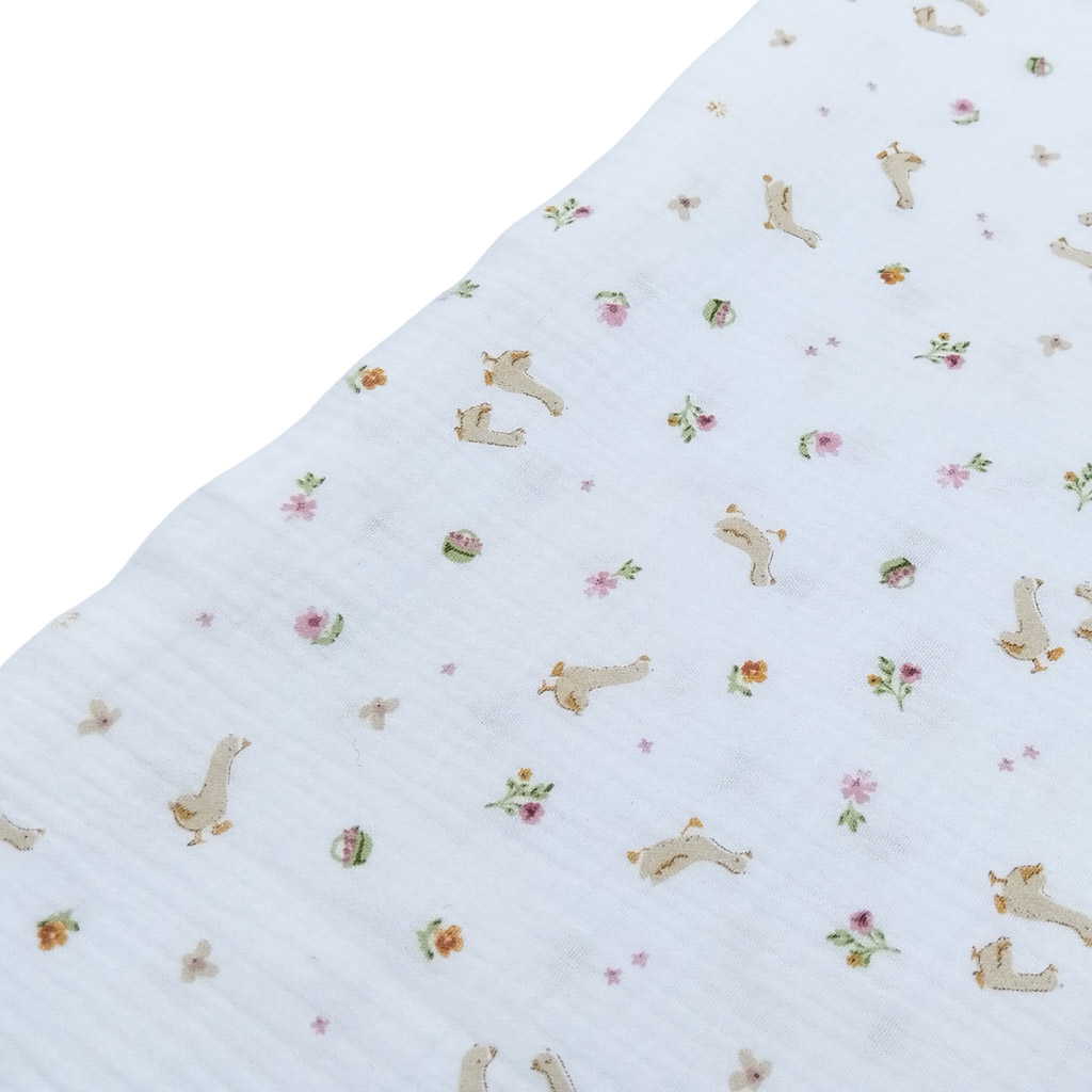 Tela de muselina de gasa doble en algodón 100% estampada con pollitos y florecitas. Esta doble gasa estampada es muy suave y está libre de tóxicos. Es perfecta para confeccionar prendas y complementos infantiles, e incluso, para decoración de hogar.