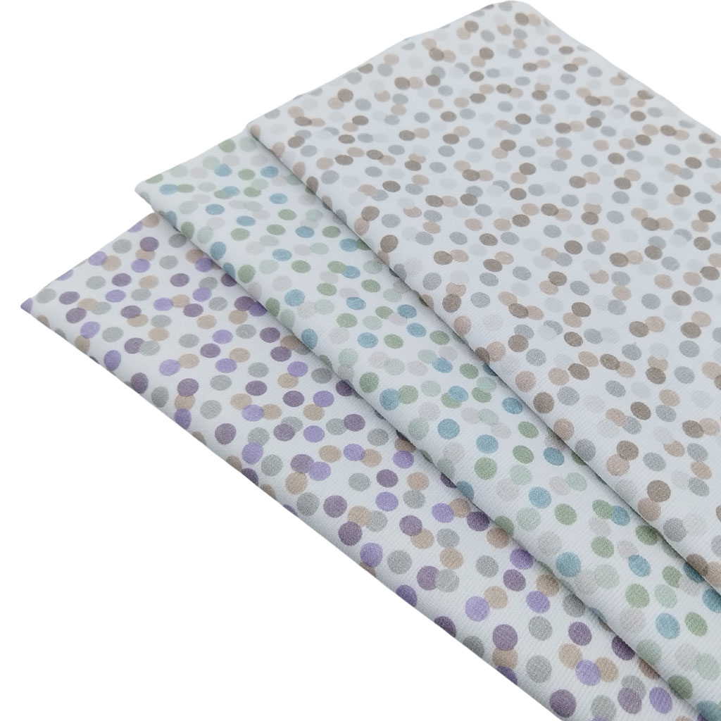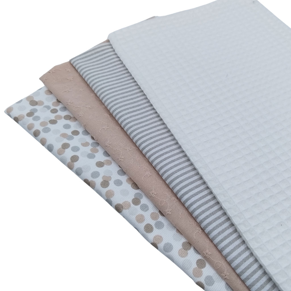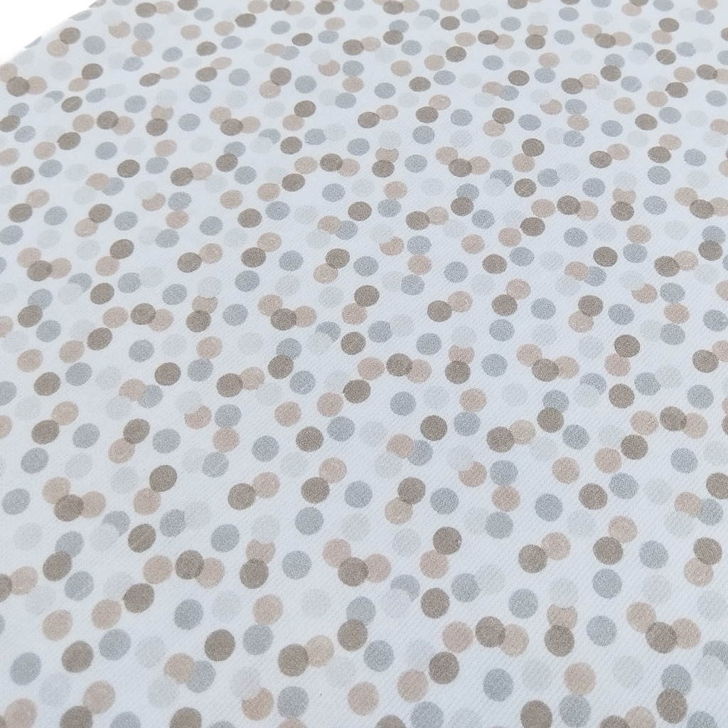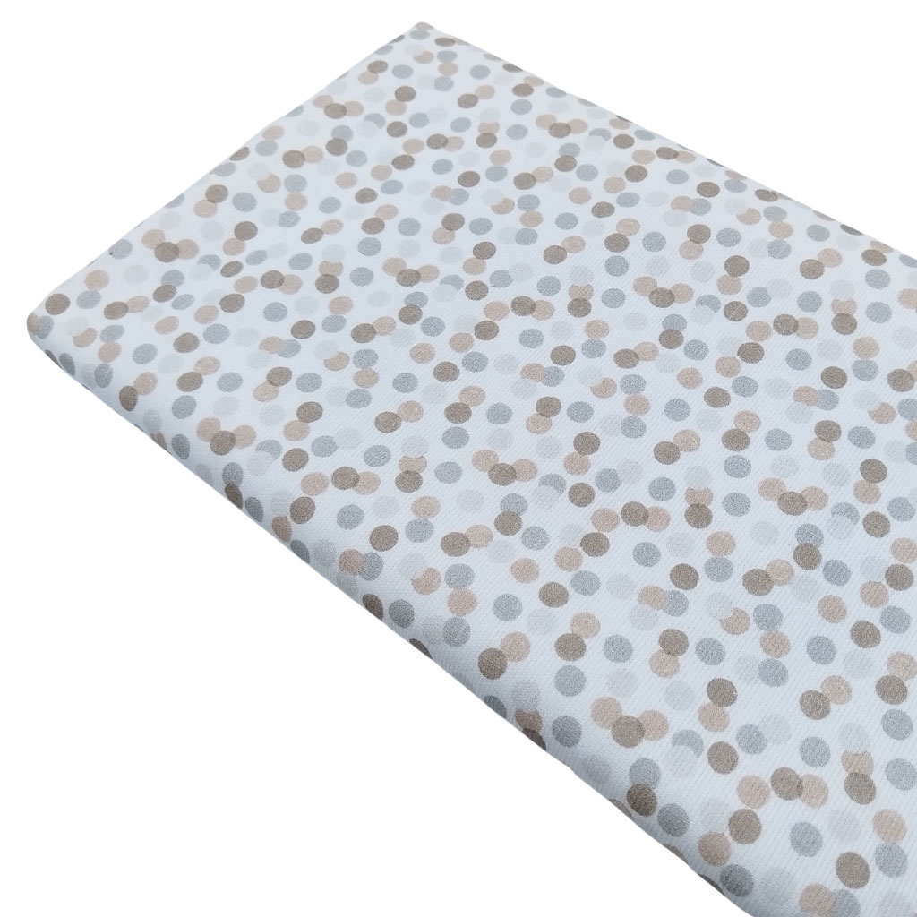 Tela de piqué de canutillo con estampado de pompas en tonos beige y perla. Es perfecta para confeccionar prendas infantiles y de bebés.