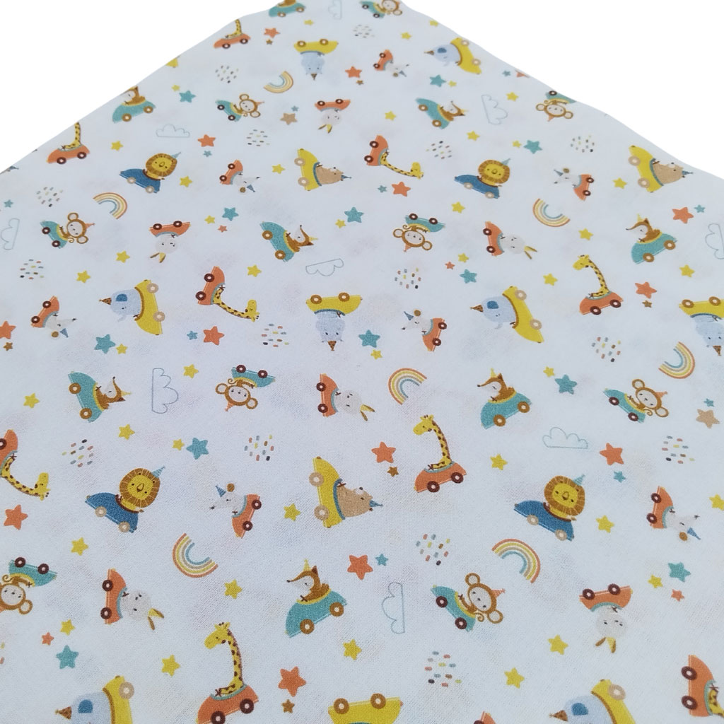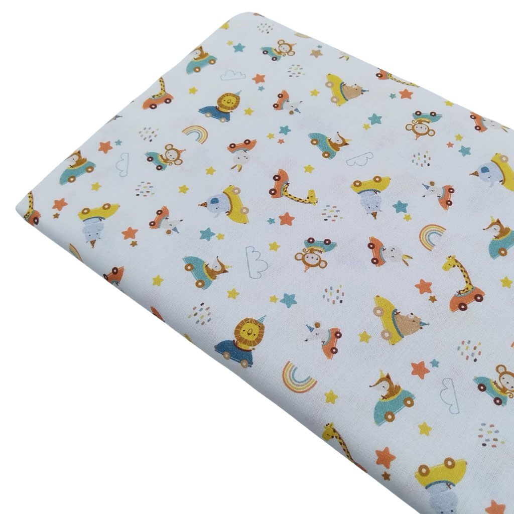 Tela popelín de algodón 100% con estampado de animalitos en coches. Presenta una textura muy suave y agradable.