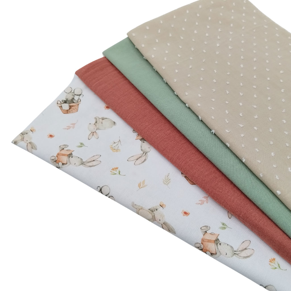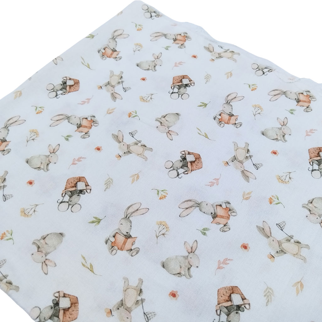 Tela popelín de algodón 100% con estampado de conejitos realizando diversas actividades. Presenta una textura muy suave y agradable.