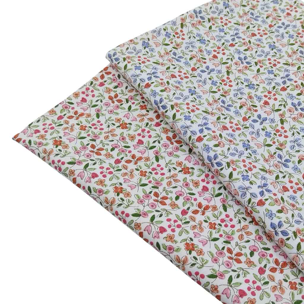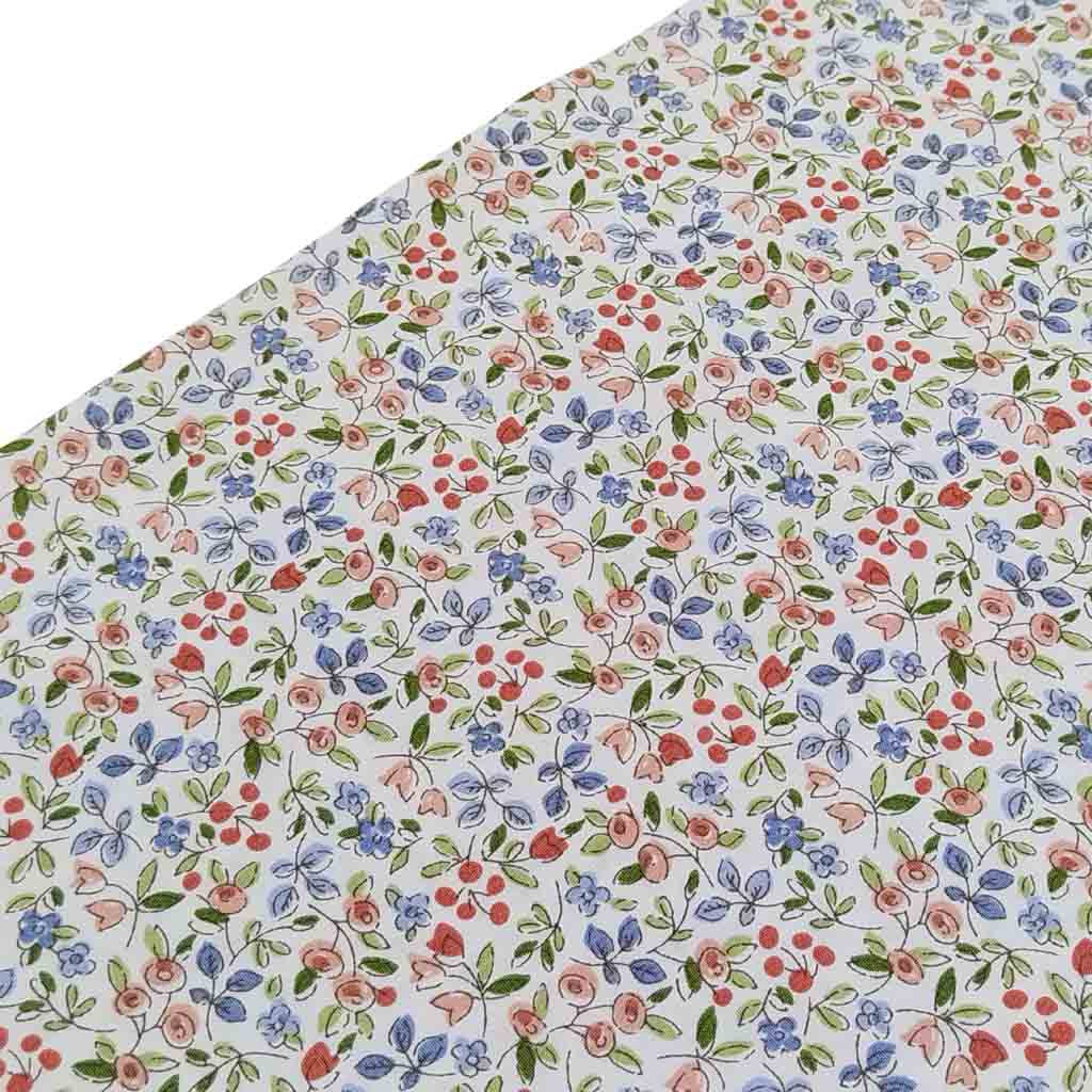 Tela popelín de algodón 100% con estampado de flores tipo liberty serie Campanillas de color azul empolvado.