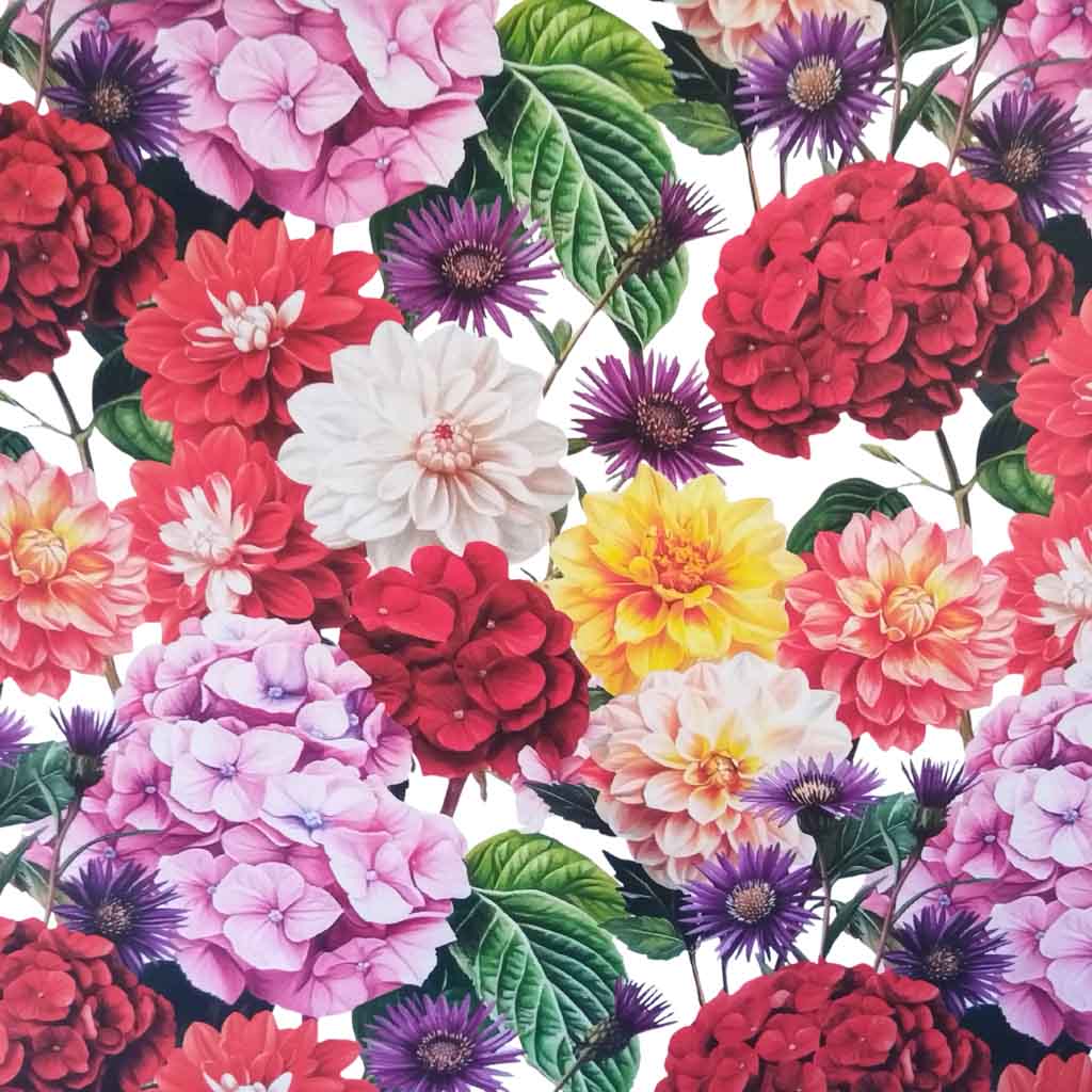 Tela popelín de algodón 100% con estampado de flores de colores. El tamaño del ramillete de hortensias es 14 centímetros. Presenta una textura muy suave y agradable. Y dispone de certificado OEKO-TEX®.