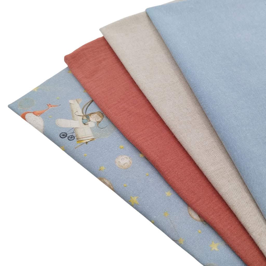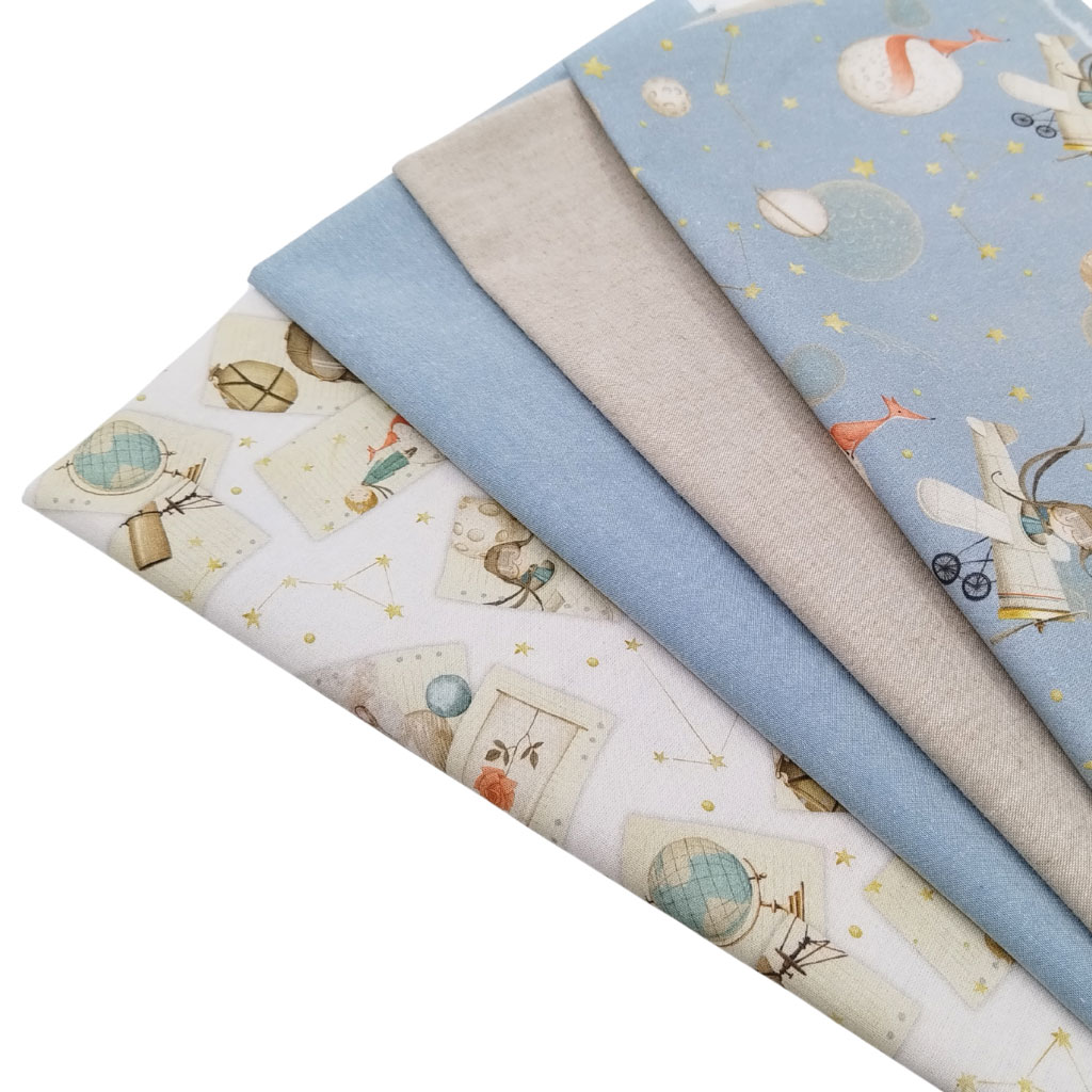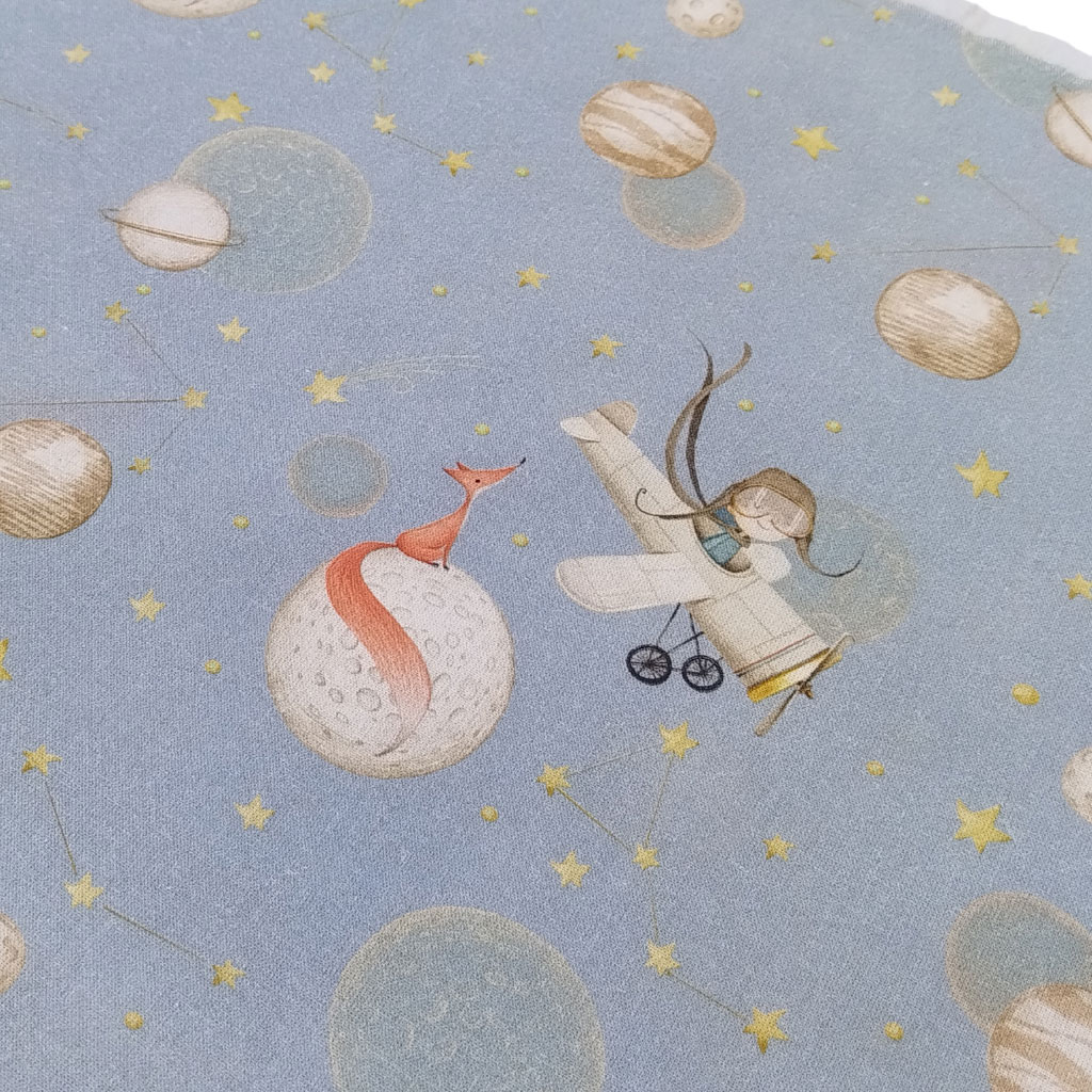 Tela popelín de algodón 100% con estampado de piloto principito en avioneta, planetas y zorrito. El tamaño del avión es 6 centímetros. Presenta una textura muy suave y agradable.