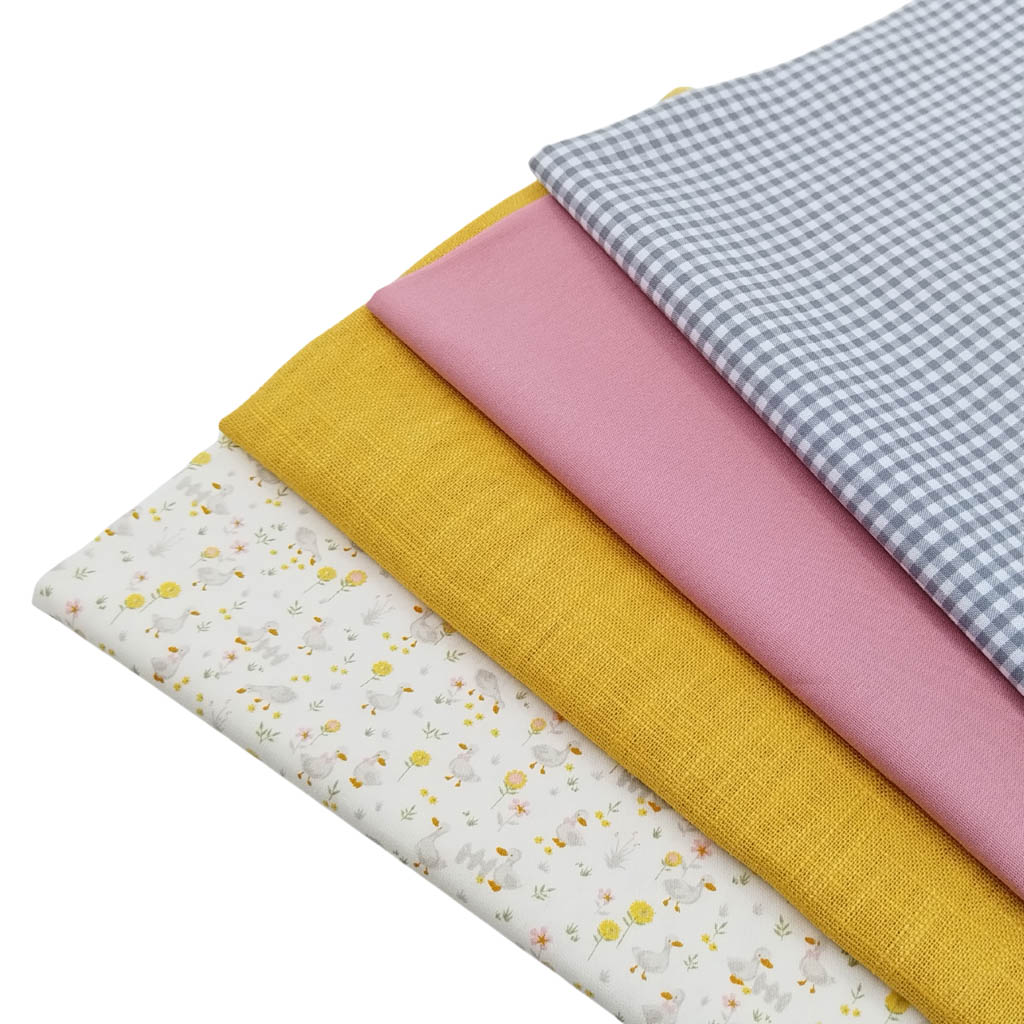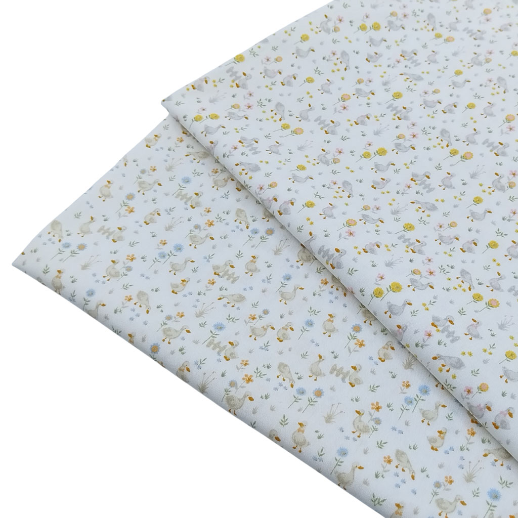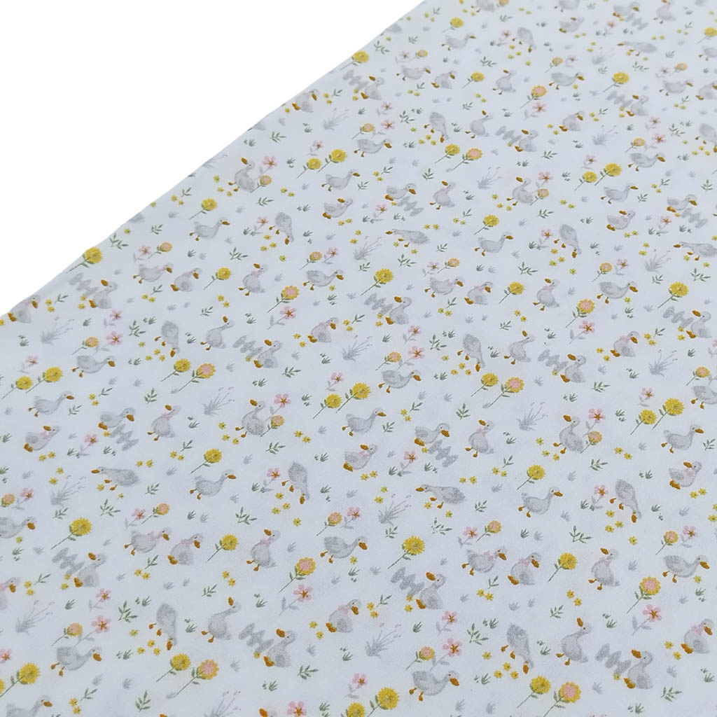 Tela popelín de algodón 100% con estampado de flores y patos serie Piquito de color amarillo.