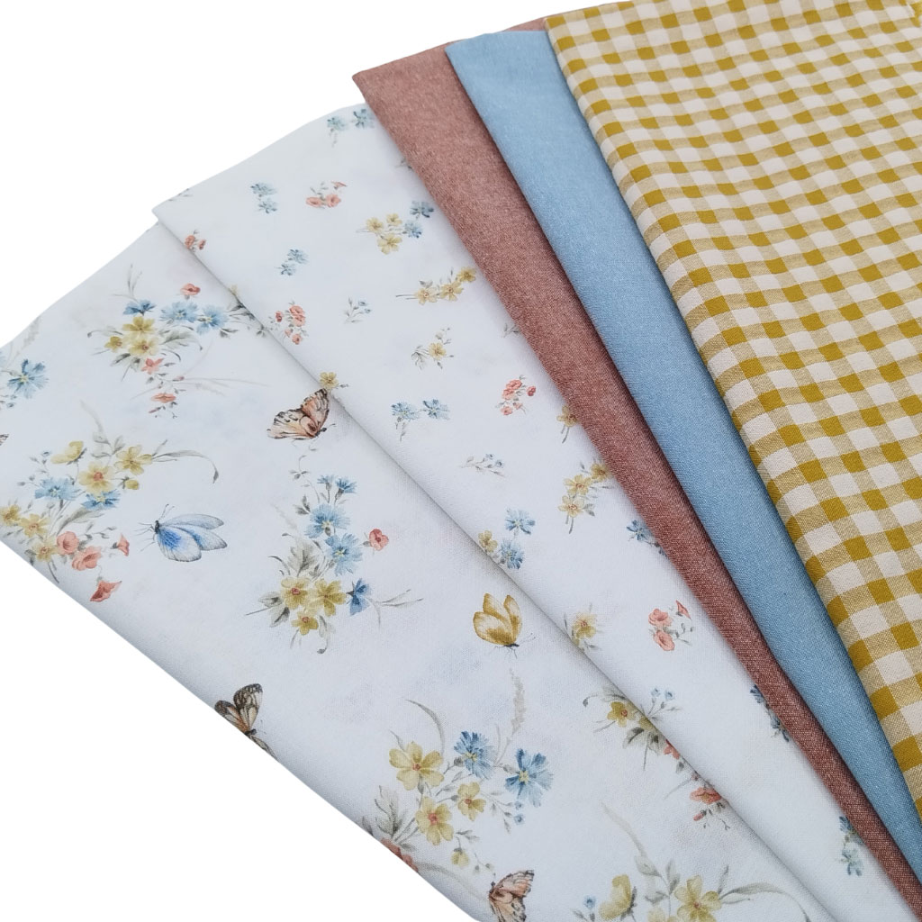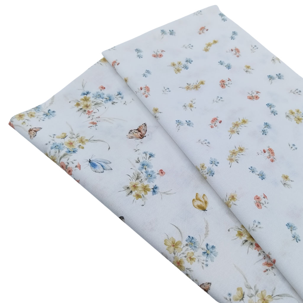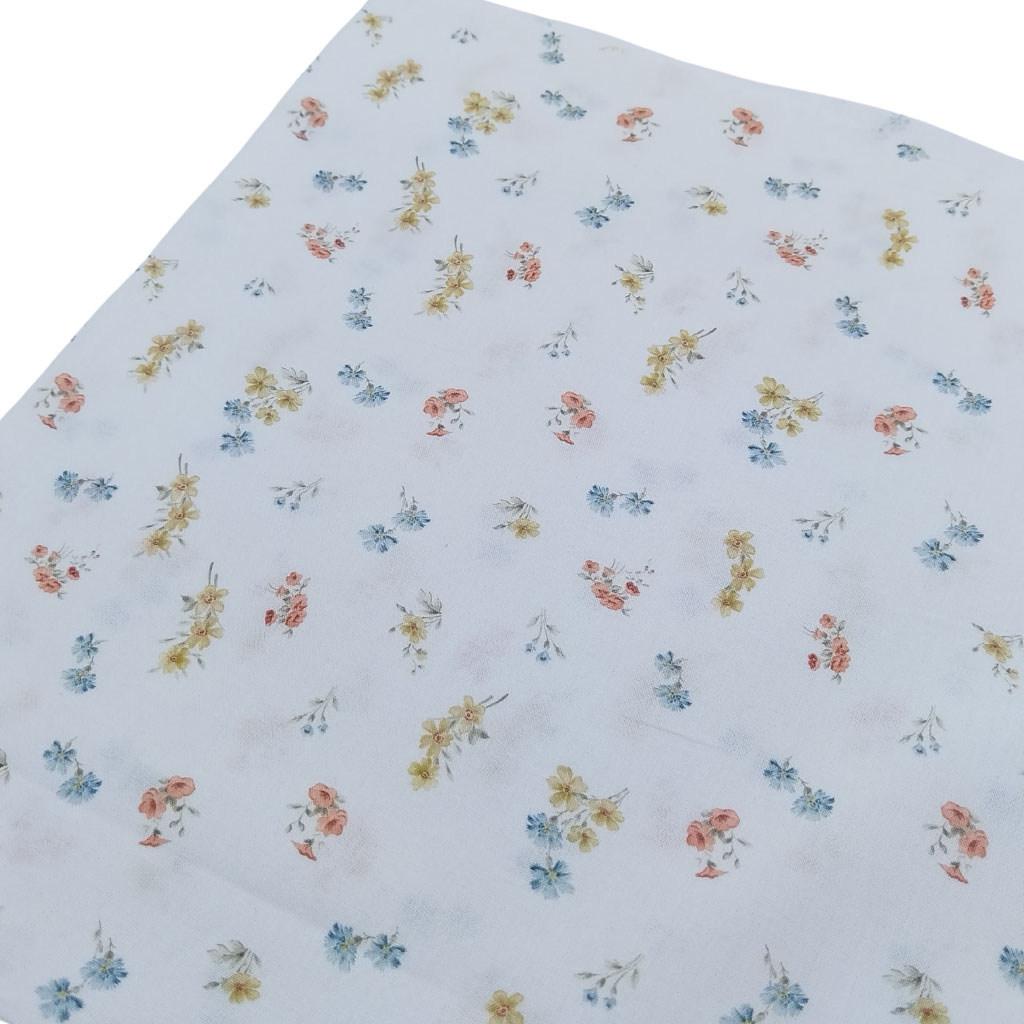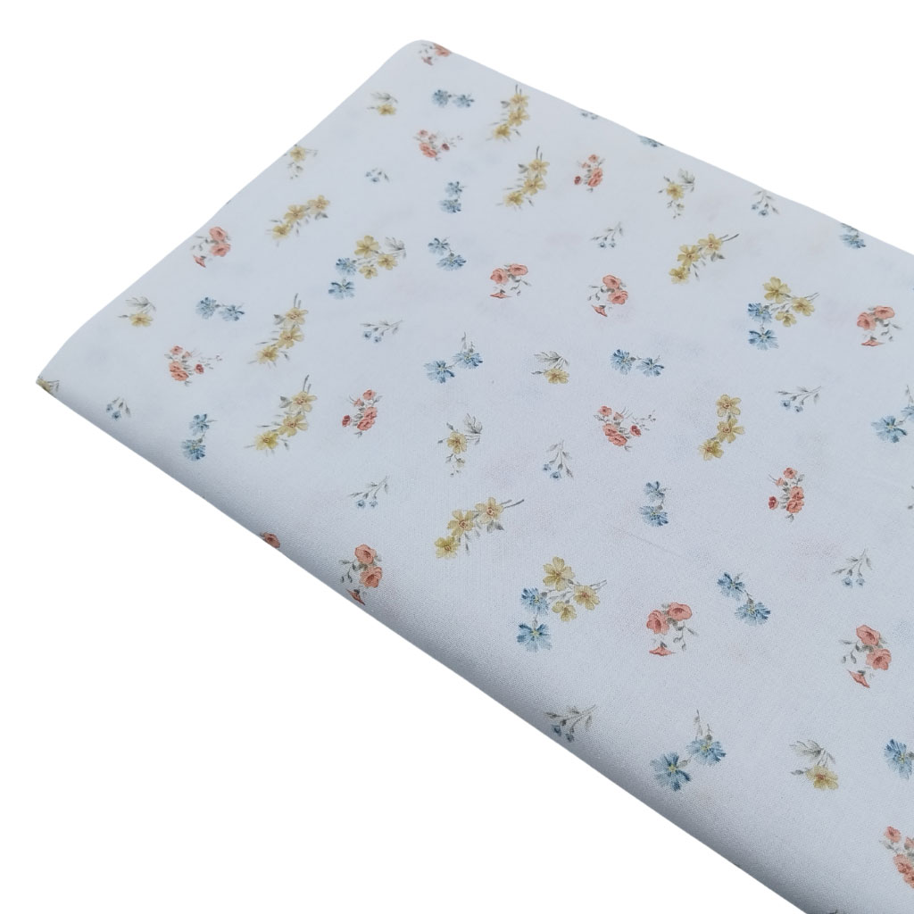 Tela popelín de algodón 100% con estampado de ramilletes de colores. Presenta una textura muy suave y agradable.