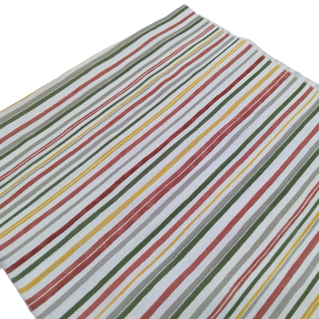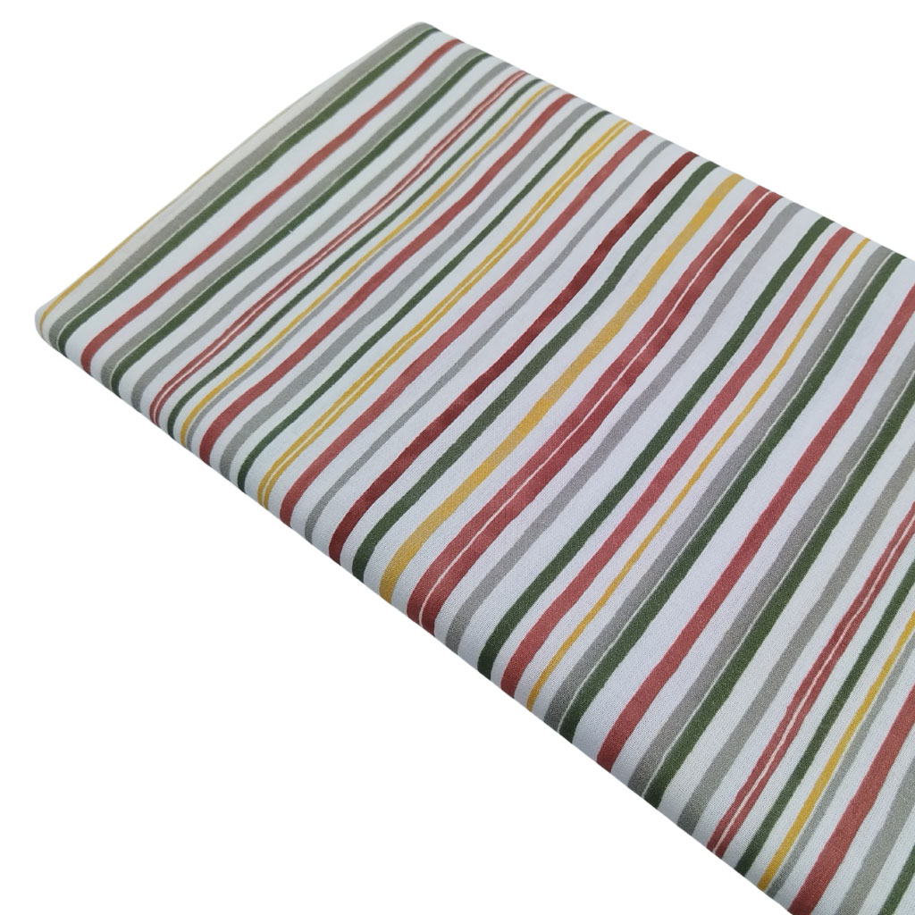 Tela popelín de algodón 100% con estampado de rayas de colores. Presenta una textura muy suave y agradable.