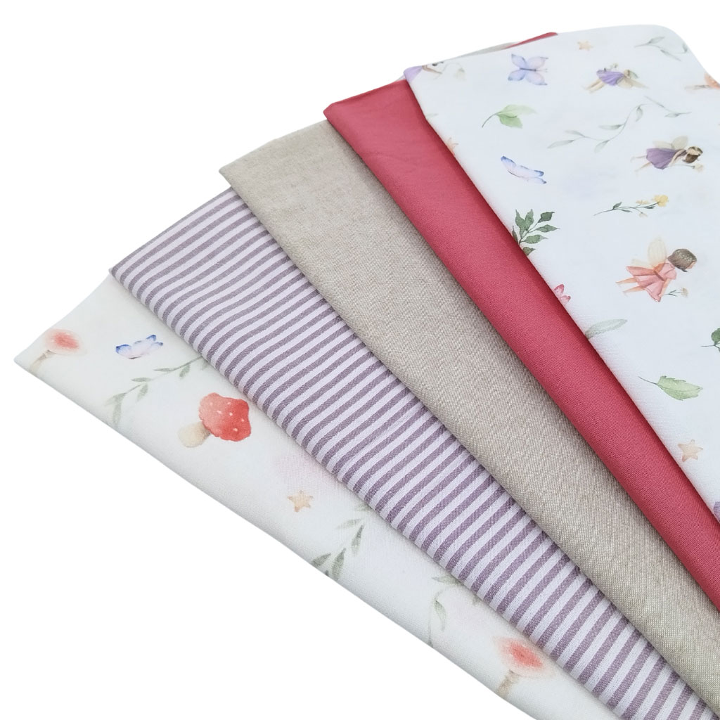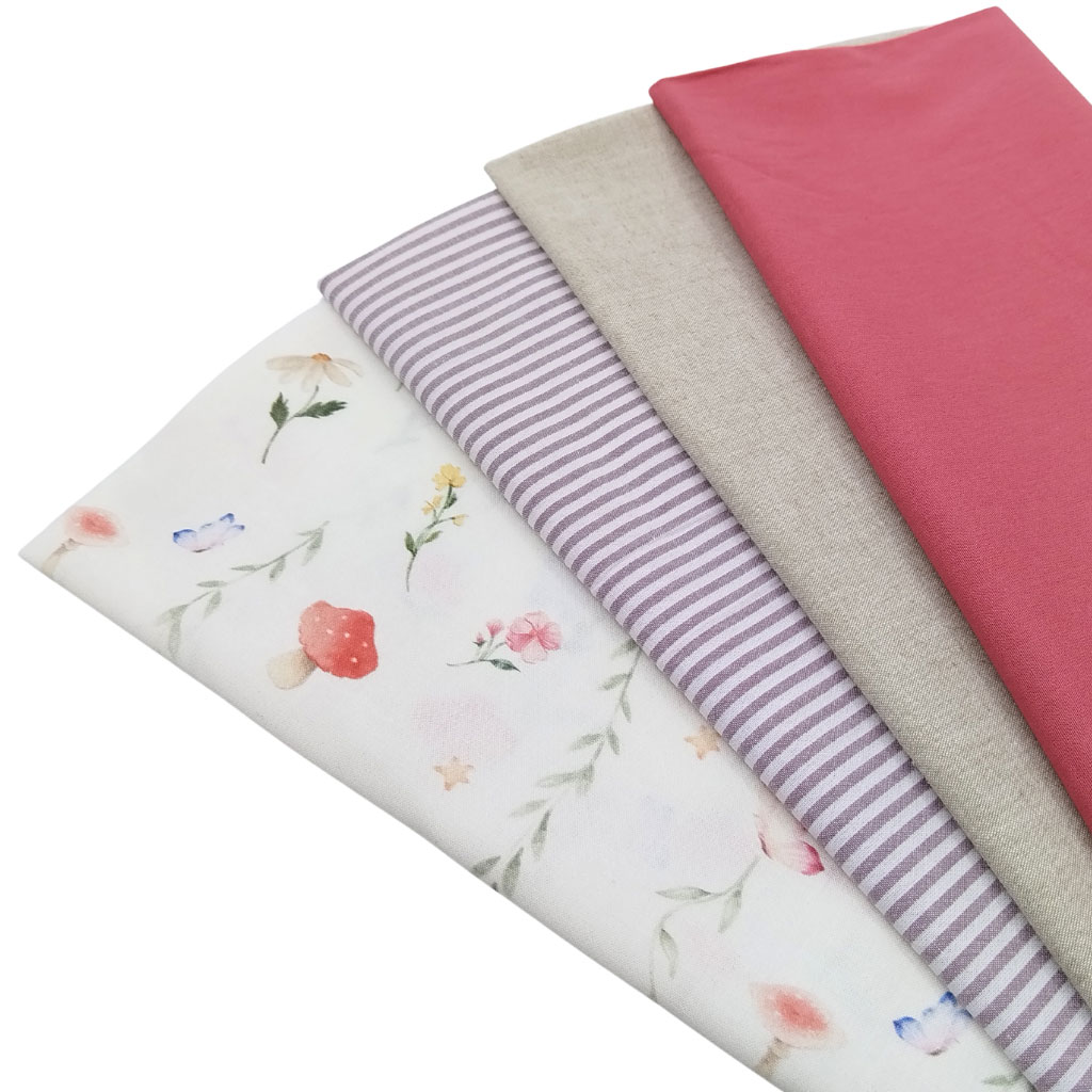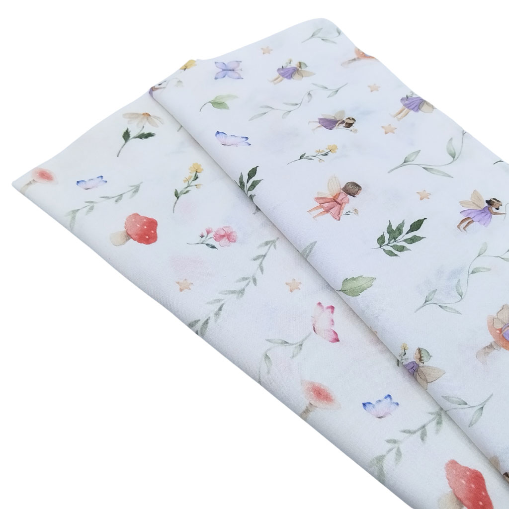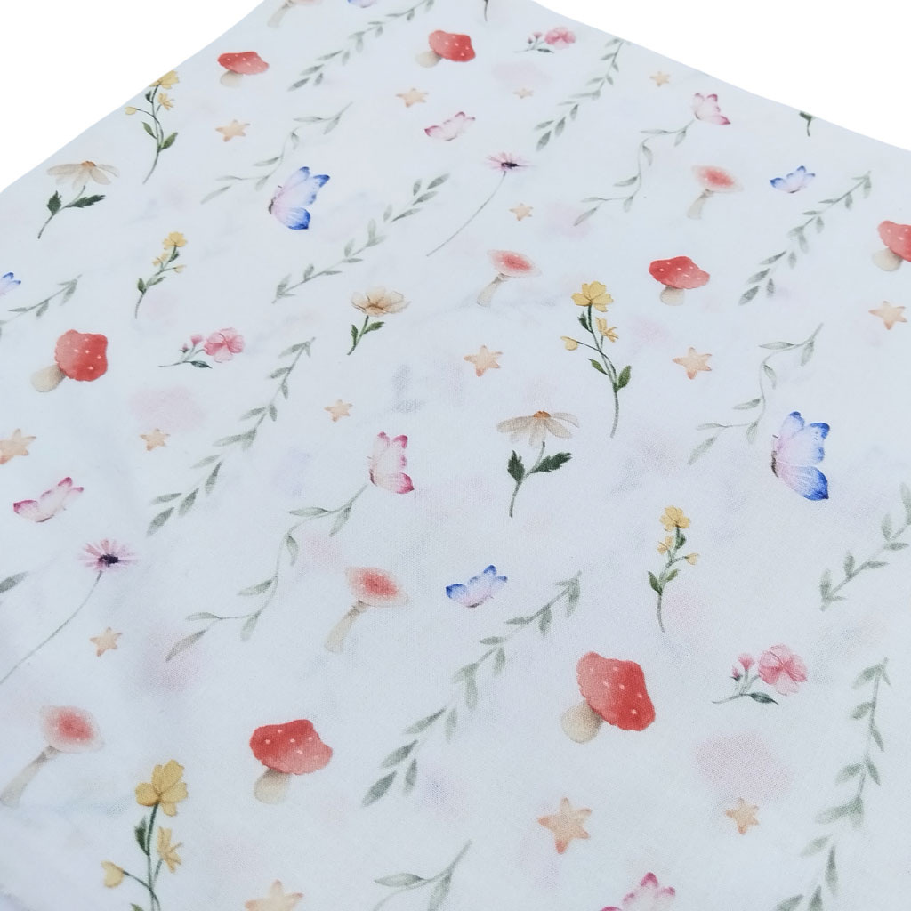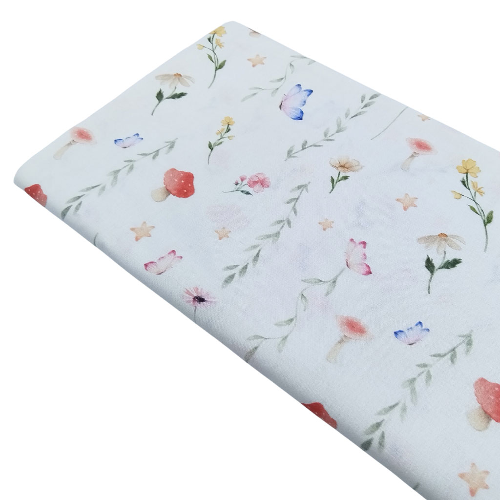 Tela popelín de algodón 100% con estampado de flores y setas. Presenta una textura muy suave y agradable.