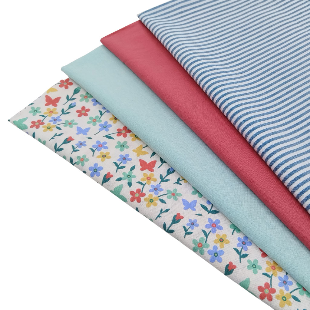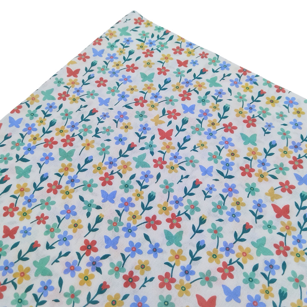 Tela popelín de algodón 100% con estampado de siluetas de flores de colores. Presenta una textura muy suave y agradable.