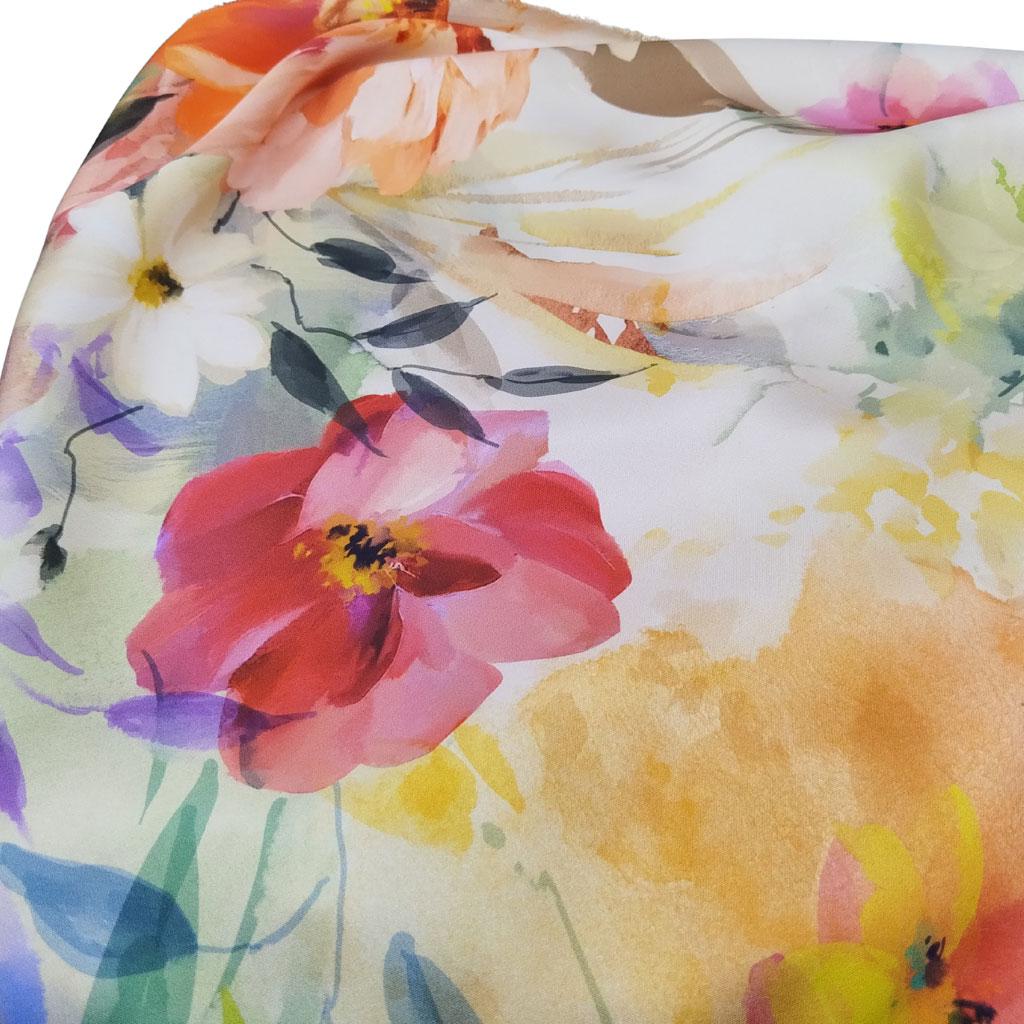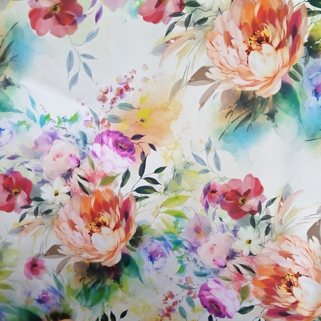 Tela de satén elástico estampado con flores de colores. Es un satén estampado fino, elástico y con caída. Perfecto para confeccionar prendas de mujer.