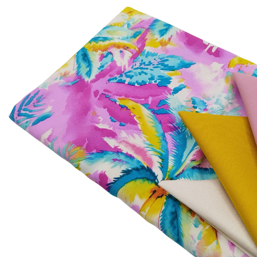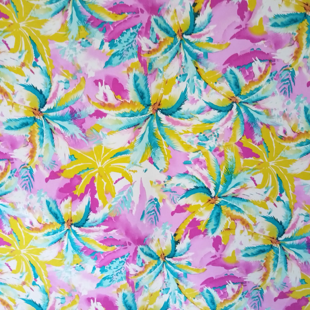 Tela de viscosa 100% estampada con palmeras multicolor de 17 centímetros de ancho. Está fabricada con fibras naturales. Es una tela suave, fina y con caída. Perfecta para confeccionar prendas únicas de mujer y niña. Se recomienda mojar o lavar antes de coser.