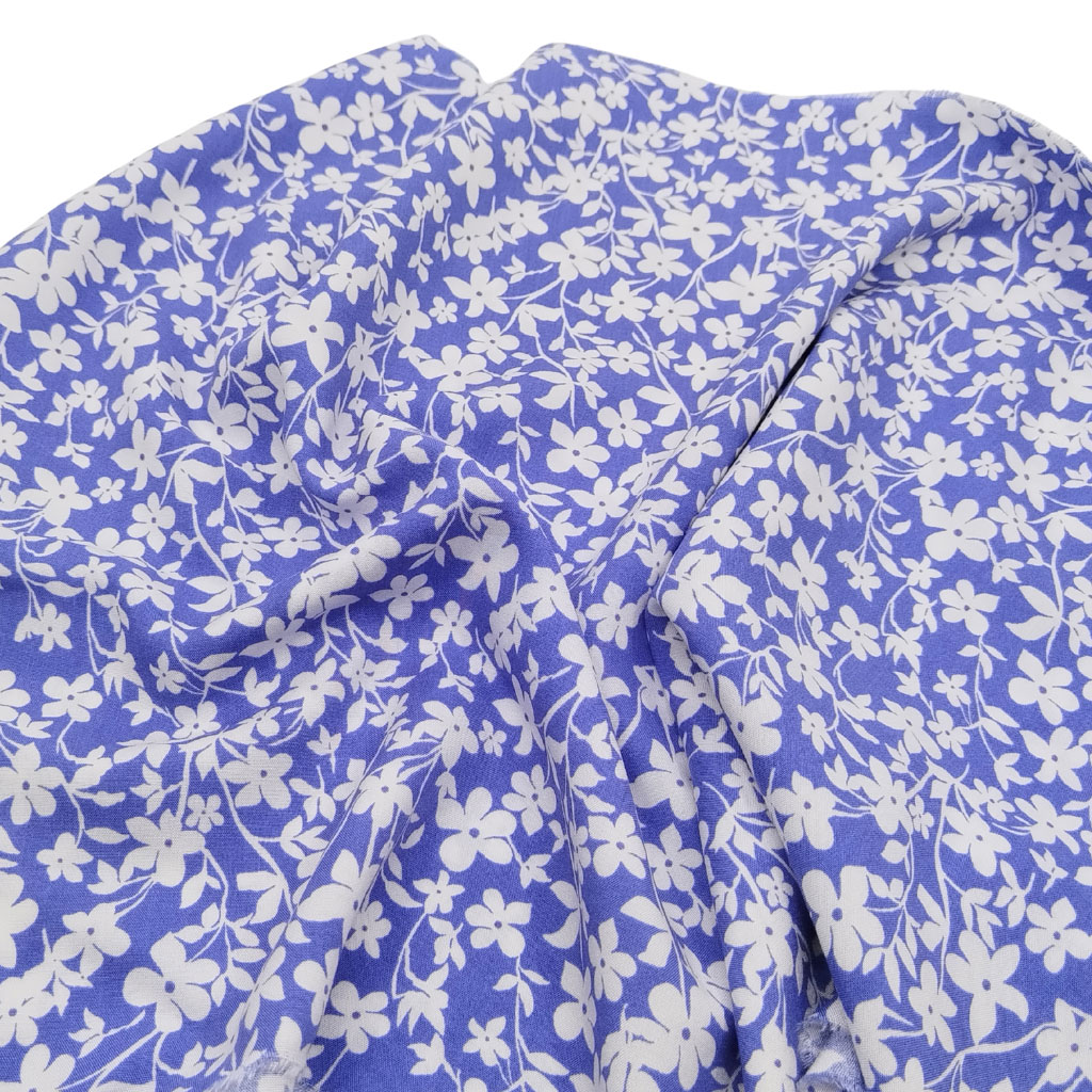 Tela de viscosa estampada con flores blancas sobre fondo color azafata. Es una tela suave, fina y con caída. Fabricada en 100% viscosa. Perfecta para confeccionar prendas frescas y agradables.
