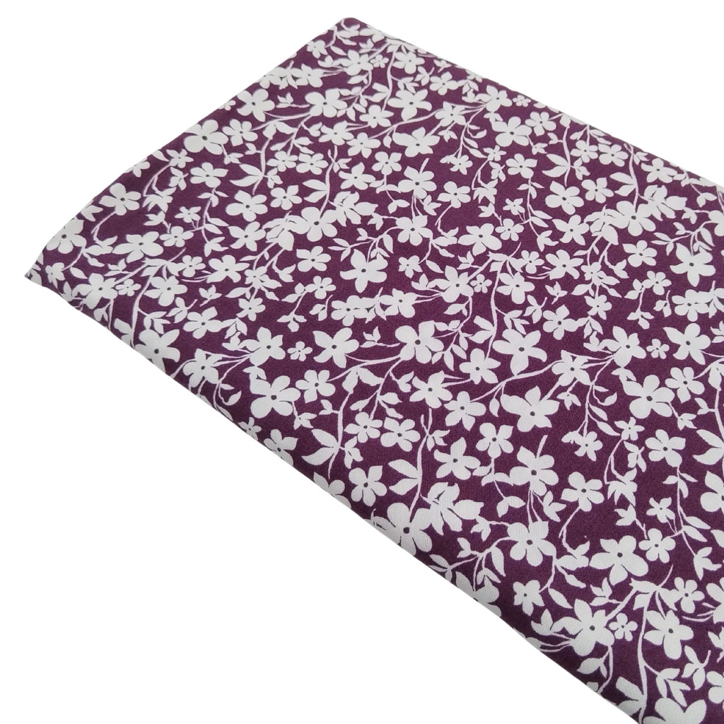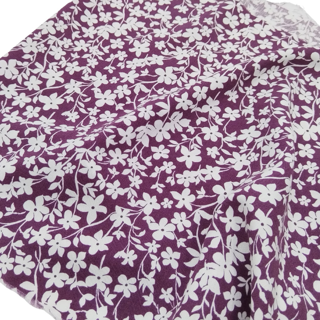 Tela de viscosa estampada con flores blancas sobre fondo color buganvilla. Es una tela suave, fina y con caída. Fabricada en 100% viscosa. Perfecta para confeccionar prendas frescas y agradables.