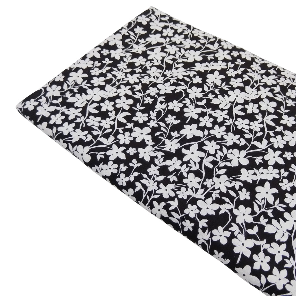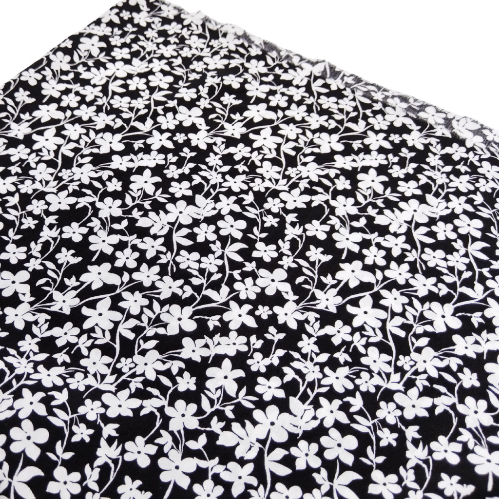 Tela de viscosa estampada con flores blancas sobre fondo color negro. Es una tela suave, fina y con caída. Fabricada en 100% viscosa. Perfecta para confeccionar prendas frescas y agradables.