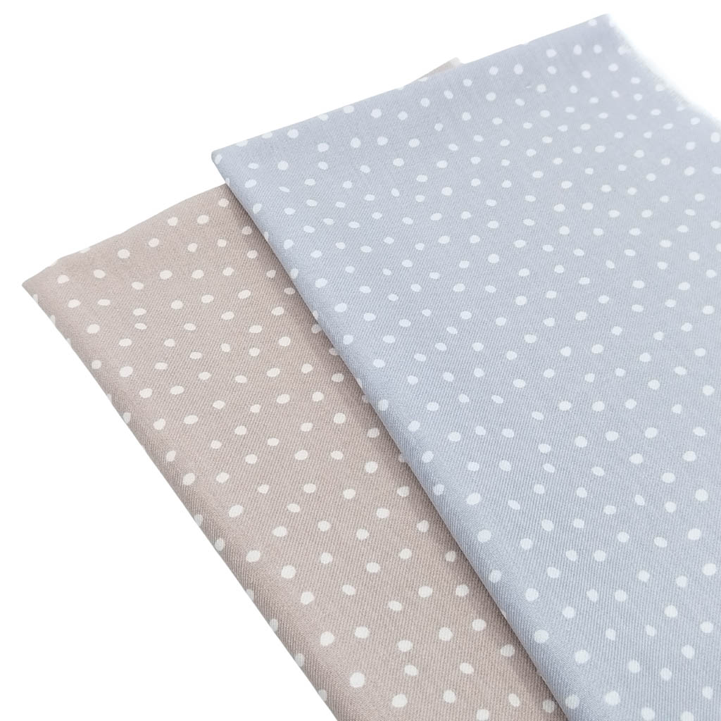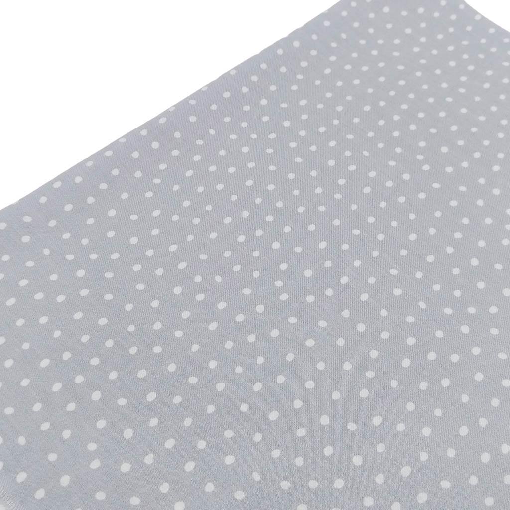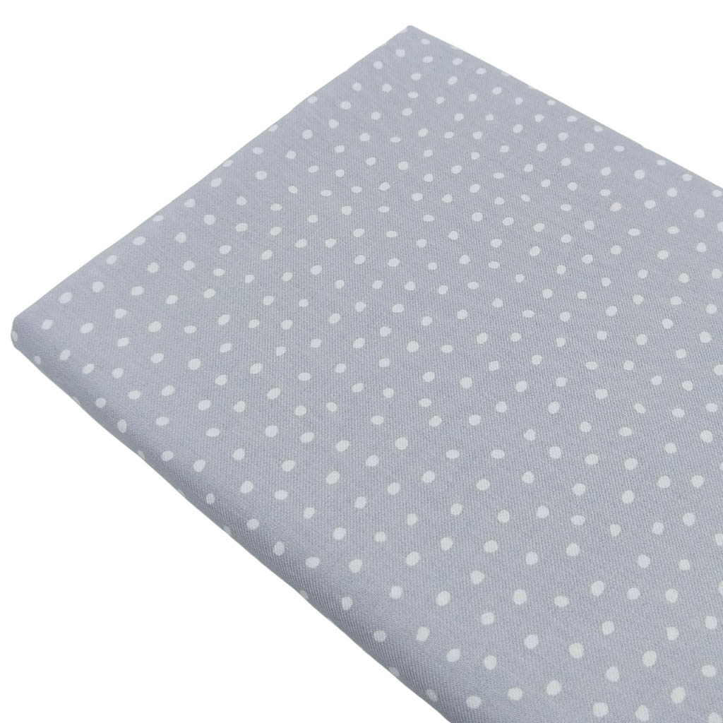 Tela viyela de algodón estampada con lunares sobre fondo gris perla. Esta viyela estampada de lunares es muy suave y agradable al tacto. Perfecta para confeccionar prendas infantiles.